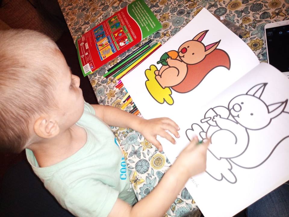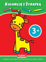 My posiadamy egzemplarz „Koloruję z Pelikanem” oraz „Koloruję z Żyrafką”. Dostępne są również dla dzieci 2+ „Koloruję z Delfinkiem”, „Koloruję z Kaczuszką”, wiek 4+ „Koloruję z Dinozaurem” i „Koloruję z Małpką”. Dzieci 5+ – „Koloruję z Króliczkiem”,  a także „Koloruję ze Słonikiem”.