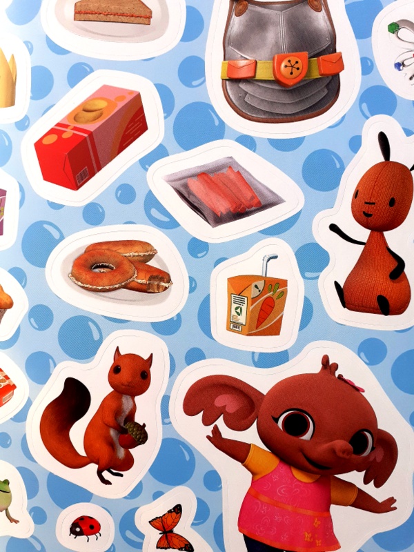 Ostatnia książeczka do wyklejania jest naprawdę super. To mój ulubiony rodzaj naklejek, bo wielokrotnego użytku. Na poszczególnych stronach znajdują się piękne ilustracje, które należy uzupełnić o określone naklejki ze środka książeczki. Znajduje się tam krótki opis sytuacji na obrazku oraz wskazówka jakie naklejki winny zostać naklejone, aby dopełnić historię.