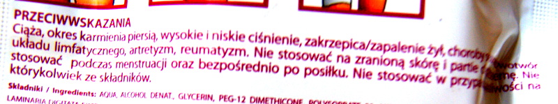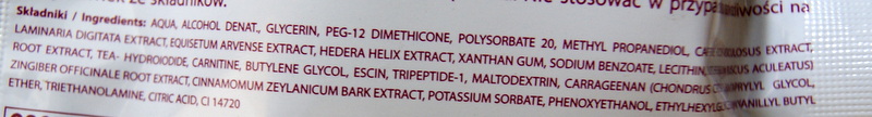 zawiera m.in. wyciągi z bluszczu, skrzypu, alg, cynamonu i imbiru oraz