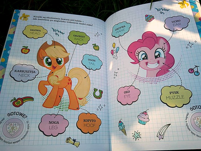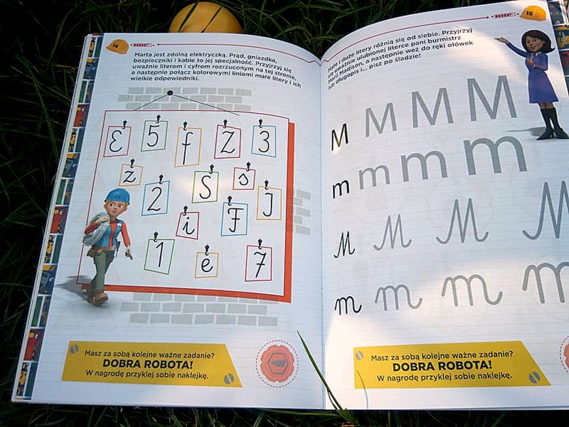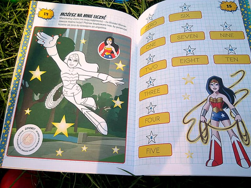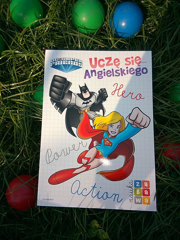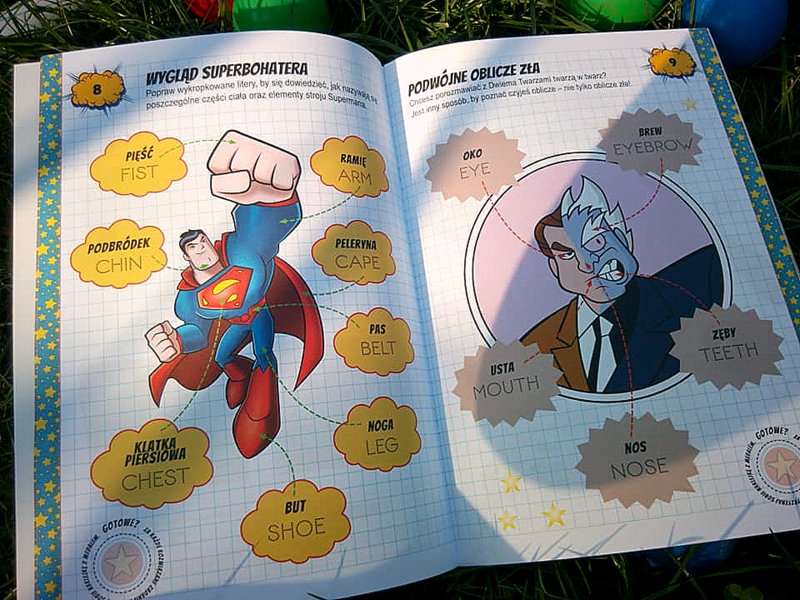 Ta książeczka uczy języka angielskiego. Uważam, że to świetna pomoc, bo język obcy najlepiej wchodzi do głowy w młodym wieku. W tej części pomagają superbohaterowie. Na poszczególnych stronach dzieci mogą zapisywać tłumaczenia angielskich słówek, podkreślać i zaznaczać wyrazy, pisać po śladzie, układać wyrazy z rozsypanki itp. Interesujące  i zajmujące formy uzupełnione w kolorowe ilustracje zachęcają do pracy z zeszytem i pomogą zapamiętać nowe słówka w obcym języku.